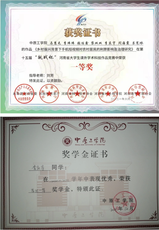 在学习方面,李庆宇同学始终把学习放在第一位,努力学习科学文化知识,她曾获2019-2020学年国家励志奖学金、2020-2021学年学业一等奖学金,在大二学年分别以537分与510分顺利通过英语四级和六级考试。她积极参加各类学科竞赛,培养自己多个领域的学科素养。她在2021年以团体赛的形式参加了第七届“挑战杯”比赛,并获得省级一等奖。此外,她还参加“互联网+大学生创新创业”大赛并获得了院级一等奖和校级三等奖。在2020年,她积极参加了全国大学生英语竞赛并通过努力获得了全国大学生英语竞赛C类初赛三等奖。