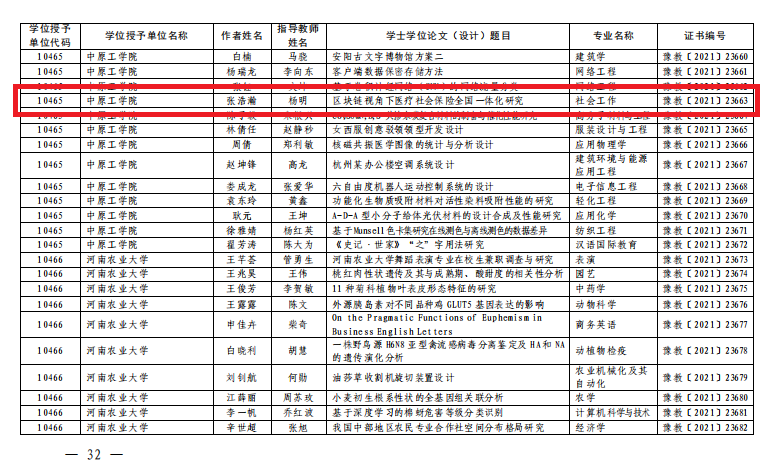 根据《河南省教育厅 河南省学位委员会关于批准2020年河南省优秀学位论文的决定》(教研〔2021〕254号),由我院社会工作系杨明老师指导,社会工作专业16级本科生张浩翰同学撰写的毕业论文《区块链视角下医疗社会保险全国一体化研究》被评为2020年河南省优秀学士学位论文(设计)。