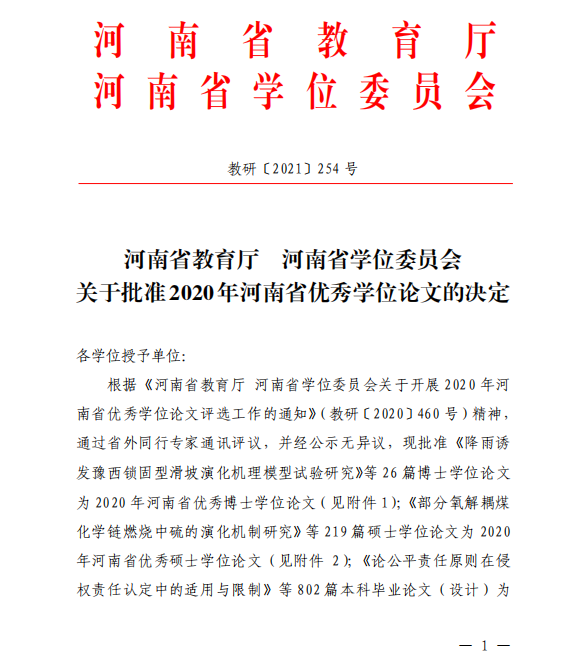 本次杨明老师指导的毕业论文荣获2020年河南省优秀学士学位论文,是我院首次获得省级优秀毕业论文荣誉,充分显示了我院师生科学严谨的治学态度和较高的教育教学水平,体现了我院内涵建设和人才培养质量的不断提升,为学院高质量发展奠定了良好的基础。