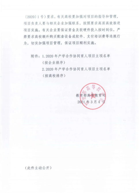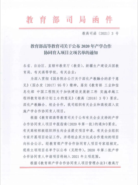 2021年3月4日,教育部高等教育司发出《教育部高等教育司关于公布2020年产学合作协同育人项目立项名单的通知》[高教司函(2012)3号],公布了2020年产学合作协同育人项目立项名单。我院付琛瑜副教授主持申报的《新文科背景下知识产权专业协同育人体系建设》项目获“新工科、新医科、新农科、新文科建设”类立项资助。