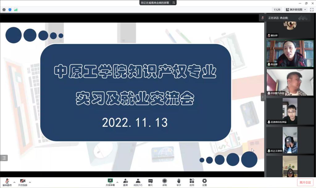 11月13日下午,我院知识产权系以线上会议形式召开了专业实习及就业交流会。会议由知识产权系系主任高金娣副教授主持,我院党委副书记陈义珊和知识产权专业百余名学生参会。