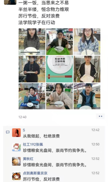 williamhill英国、知识产权学院返校学生第一餐开展“倡节俭风尚 光盘行动从我做起”主题活动。引导同学们树立节约光荣、浪费可耻的思想观念,使勤俭节约、反对浪费成为学生的行为习惯和生活方式。活动一经开展,得到了的同学们的积极响应,大家纷纷打卡拍照发朋友圈宣传,带动身边的同学加入到本次光盘行动之中,营造“光盘一族光荣、餐桌浪费可耻”的饮食文化氛围,在实际行动中大力弘扬中华民族勤俭节约的优良传统,增强文明节俭意识,树立勤俭节约的生活观。 (通讯员:张瑞 丁媛)