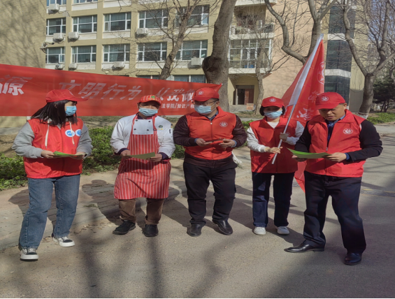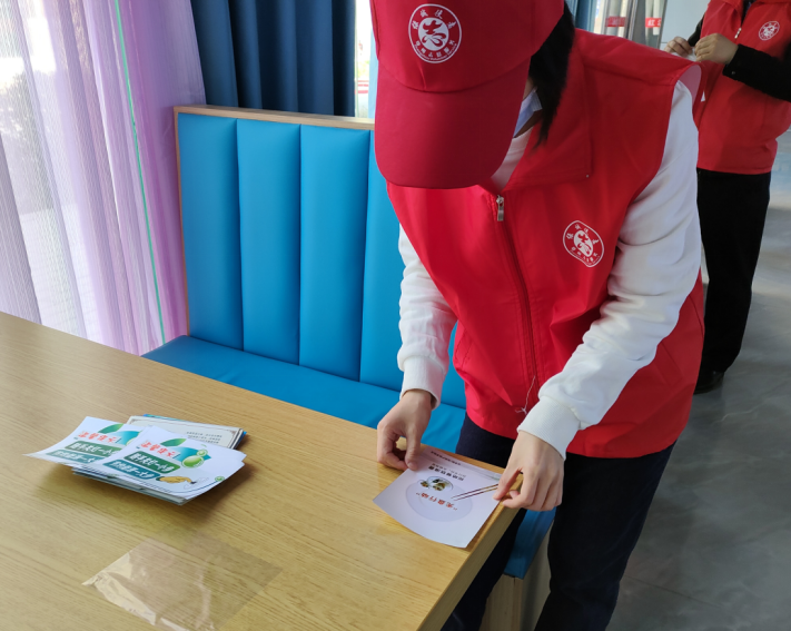 党员教师志愿者向过往师生发放《厉行勤俭节约、倡导低碳生活》宣传单,宣讲勤俭节约的传统美德,倡议节俭生活、倡导节俭风尚。