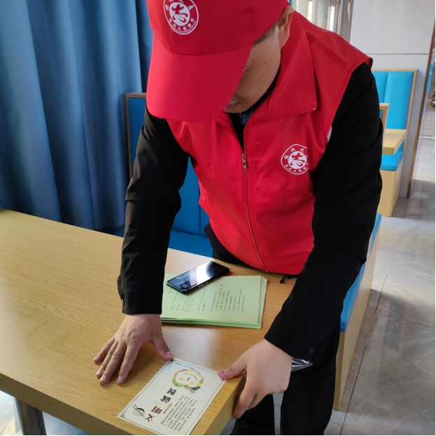 在餐厅里,教师志愿者在餐桌上、用电开关旁边和就餐附近张贴节约粮食、节约用电和文明就餐的标语,时刻提醒就餐师生保持勤俭节约的文明就餐行为。