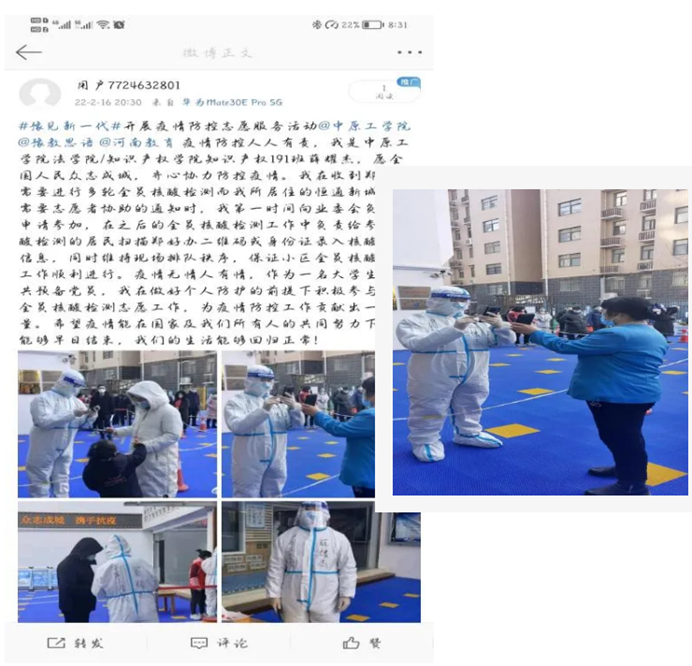知识产权191班薛耀杰同学作为一名中共预备党员,积极响应当地政府的号召,第一时间参与到疫情防控一线志愿服务工作之中。1月7日起,他积极参与了河南省郑州市中牟县恒通新城社区的核酸检测活动,主要负责核酸检测信息录入、维持现场排队秩序等,以保证核酸检测工作的顺利进行,协助社区工作人员累计完成了7轮核酸检测工作。他认为,作为一名大学生,在做好个人防护的前提下应积极参与志愿服务活动,为疫情防控工作献出一份自己的力量。让我们坚信,疫情终会过去,静待春暖花开。在抗击疫情的路上,你我同行。
