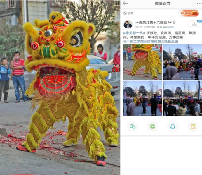 火树银花合,星桥铁锁开。法学201班招颖同学元宵佳节在家乡观看舞狮表演,宣传中国传统文化。她认为,狮子是勇敢和力量的象征,新的一年,新的开始,新的征程,祈愿我们都能像狮子一样勇敢生活,战胜困难,平安顺遂,万事如意。