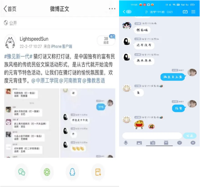 虽然假期在家不能见面,但也依然阻挡不住同学们欢度元宵佳节的愿望。法学211班、法学191班为丰富活动形式,组织开展了线上猜灯谜活动。有成语谜、地名谜、人物谜等,内容丰富,趣味盎然,既具娱乐性,又具知识性,为元宵佳节增添了浓厚的节日氛围。