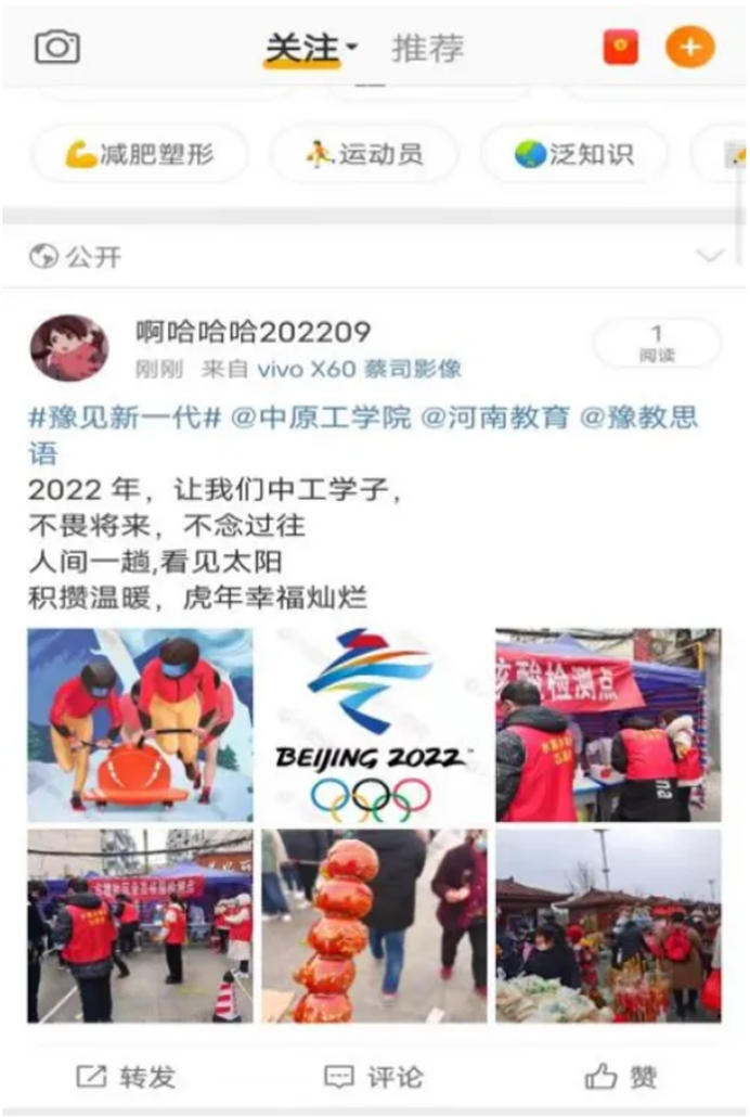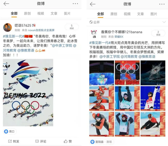 冬奥会期间,知产191班侯韶青、贾静文等同学观看奥运比赛,网络发帖为奥运健儿们加油喝彩,分享内心的激动和喜悦,中华民族精神和奥林匹克精神交融激荡在神州大地、激荡在青年学子心中。