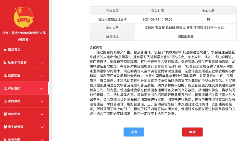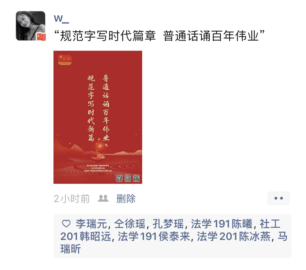 社会工作181班制定了团日活动策划书,线上开展了“同语同心”主题团日活动,组织团支部成员通过朋友圈或者空间接力参加了推广普通话宣传活动,将学好、讲好普通话的精神传递给身边人。