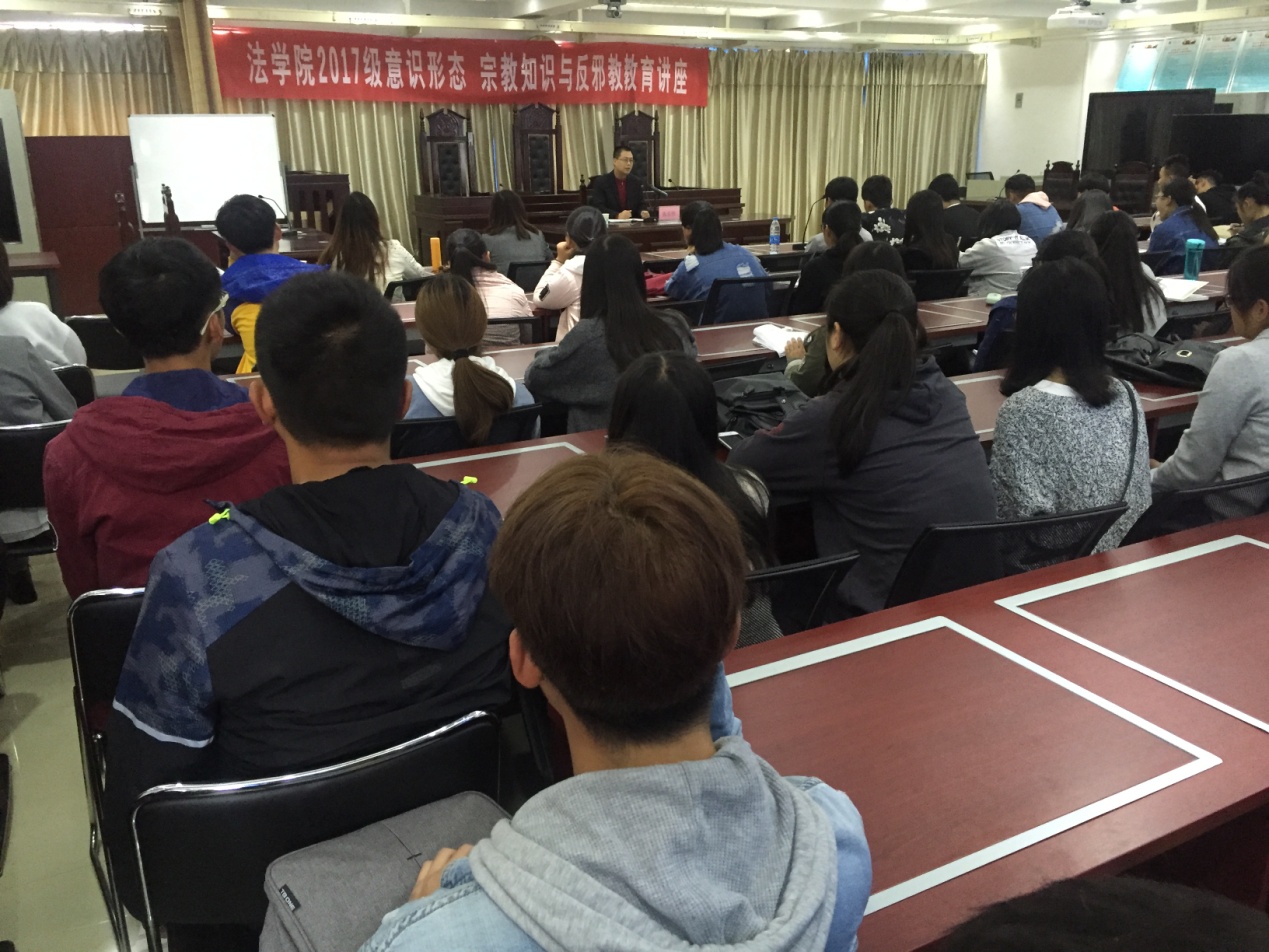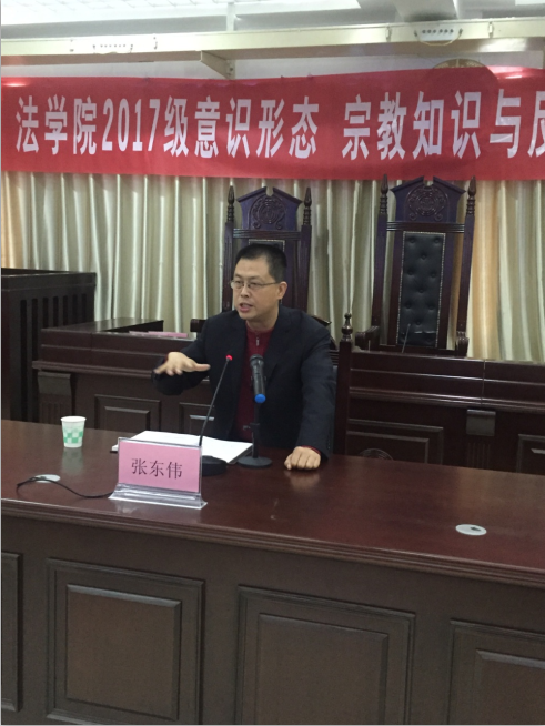 10月11日上午8:30,“williamhill英国/知识产权学院2017级意识形态 宗教知识与反邪教教育”讲座在八号楼模拟法庭隆重开讲,我校党委宣传部长张东伟教授做了报告,我校师生近200人聆听报告,讲座由学院党总支副书记任继江主持。