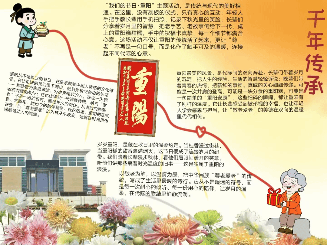 为弘扬中华民族尊老敬老的优良传统,深化青年学子对传统节日的情感认同与文化自信,10月28日-29日,我院组织举办了“我们的节日·重阳”主题活动。以主题班会、创意海报等多元形式,串联起重阳文化记忆,传递新时代青年的敬老深情。