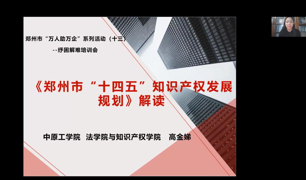 2022年10月28日,知识产权系主任高金娣副教授应邀参与郑州市“万人助万企”系列活动,为专精特新企业作纾困解难线上直播培训,对《郑州市“十四五”知识产权发展规划》(以下简称规划)进行解读。本次培训由郑州市工业和信息化局主办,河南智盈知识产权中小企业公共服务示范平台、河南省中小企业公共服务平台有限公司承办,郑州广播电台协办。