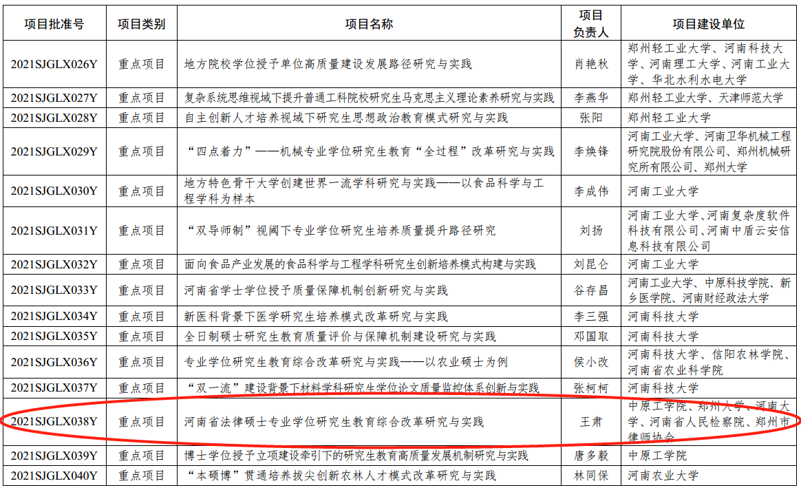 近日,河南省教育厅下发《关于公布 2021年河南省高等教育教学改革研究与实践项目(学位与研究生教育)立项名单的通知》(教研〔2021〕480 号),批准269 项河南省高等教育教学改革研究与实践项目(学位与研究生教育)予以立项建设,我院院长王肃教授主持的《河南省法律硕士专业学位研究生教育综合改革研究与实践》获得重点项目立项。