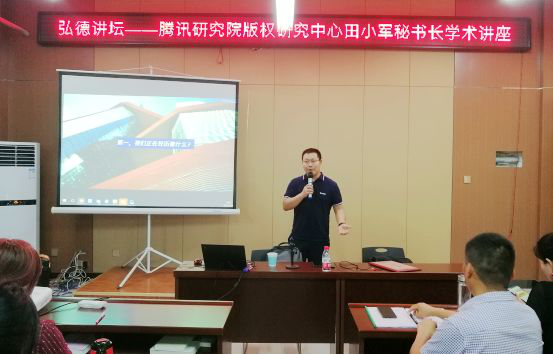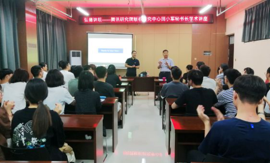 本次活动是弘德讲坛的系列讲座之一。田小军先生系中国政法大学法学博士,腾讯研究院版权研究中心秘书长。从事互联网与知识产权、数据竞争、文娱体育产业相关工作与研究。在《出版发行研究》《中国出版》《中国版权》《电子知识产权》、财新、FT中文网等期刊媒体发表文章50余篇,并多次接受新华社、央广、法制日报等媒体的采访。田小军秘书长的报告使我校师生了解到互联网行业的发展成果及互联网驱动版权制度创新的相关前沿知识,激发广大师生对互联网法律问题尤其是互联网版权研究方向的浓厚兴趣,获与会师生的一致好评,取得了很好的效果。(文/岳园园、图/柯艳莉)