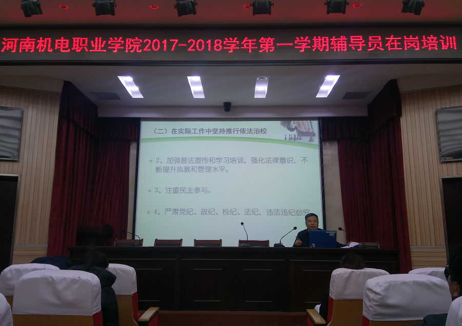 12月14日下午,应河南机电职业学院邀请,我院党总支书记李庆教授在该校产研楼报告厅为该校全体辅导员开设了一场专题法制讲座。