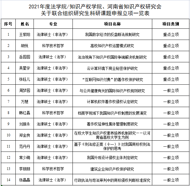 根据2021年度williamhill英国、河南省知识产权研究会研究生课题立项工作安排,经学院充分动员、组织我院研究生积极进行课题申报,并依程序组织校内外专家进行评审。在坚持导师回避、公平公正评审的基础上,共决定对14项课题申报予以立项,其中重点项目5项,一般项目9项。现将立项结果公示如下:
