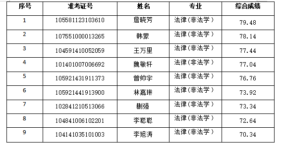 按照学校招生工作安排,根据我院攻读法律硕士研究生初试、复试综合结果,现公布考生入学考试综合成绩排名: