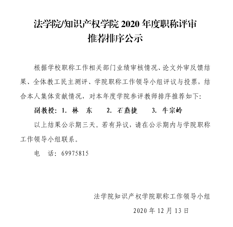williamhill英国/知识产权学院2020年度职称评审推荐排序公示