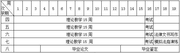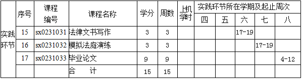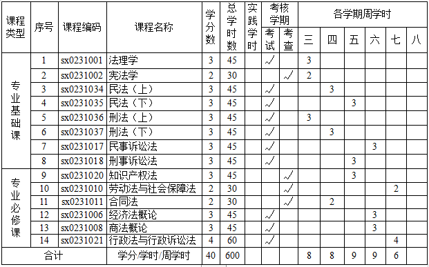 法学专业(辅修)的总学分为55学分。其中专业基础课20学分,计300学时;专业必修课20学分,计300学时;实践环节15学分,共15周(在主修专业实践环节期间或假期进行)。