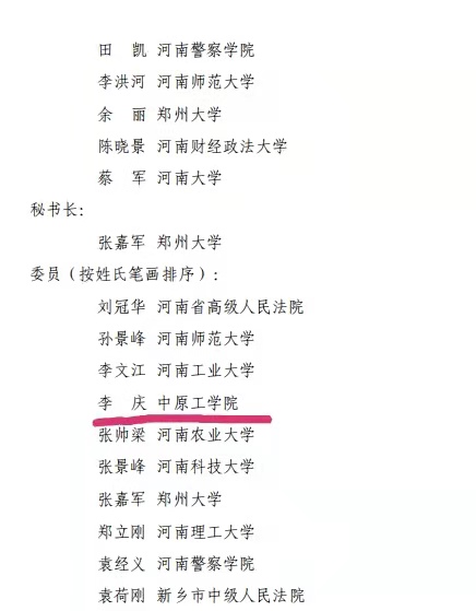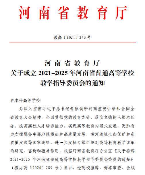 7月7日,河南省教育厅办公室印发了《河南省教育厅关于成立2021-2025年河南省普通高等学校教学指导委员会的通知》(教高〔2021〕243 号),决定成立2021-2025年河南省普通高等学校教学指导委员会,公布了2021-2025年河南省普通高等学校教学指导委员会名单。我院李庆教授被聘为“法学与政治学类”教学指导委员会委员。