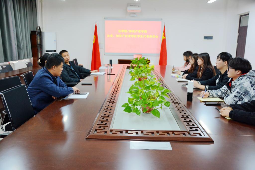 付琛瑜简要介绍了学院整体发展概况以及双学位人才培养情况。法学、知识产权双学位班学生代表逐一围绕双学位教学、课堂管理、学生考研、就业几方面提出了自己的具体意见和建议,与会人员认真聆听、记录,就同学们普遍关切的考研、考公、法考等方面的具体问题进行了回应和交流。