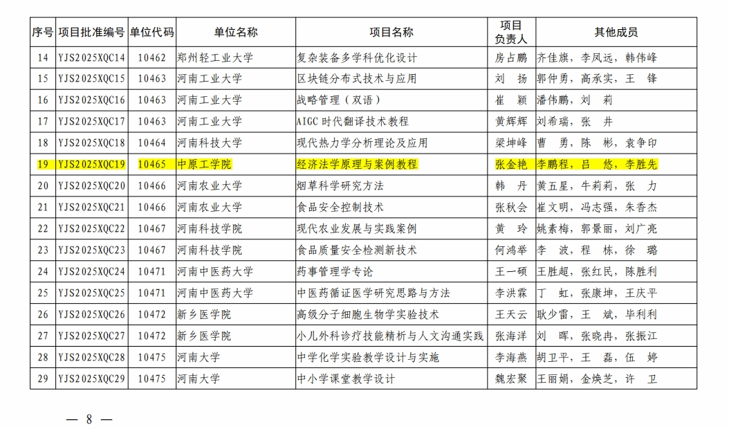近日,2025年河南省研究生教育改革与质量提升工程项目评选结果公布,我院喜获3项:王肃院长的研究生精品教学案例项目《知识产权法学》、张金艳副院长的研究生校企(产)联合精品教材项目《经济法学原理与案例教程》及张秋芳副教授的研究生精品在线课程项目《刑法学(上)》。