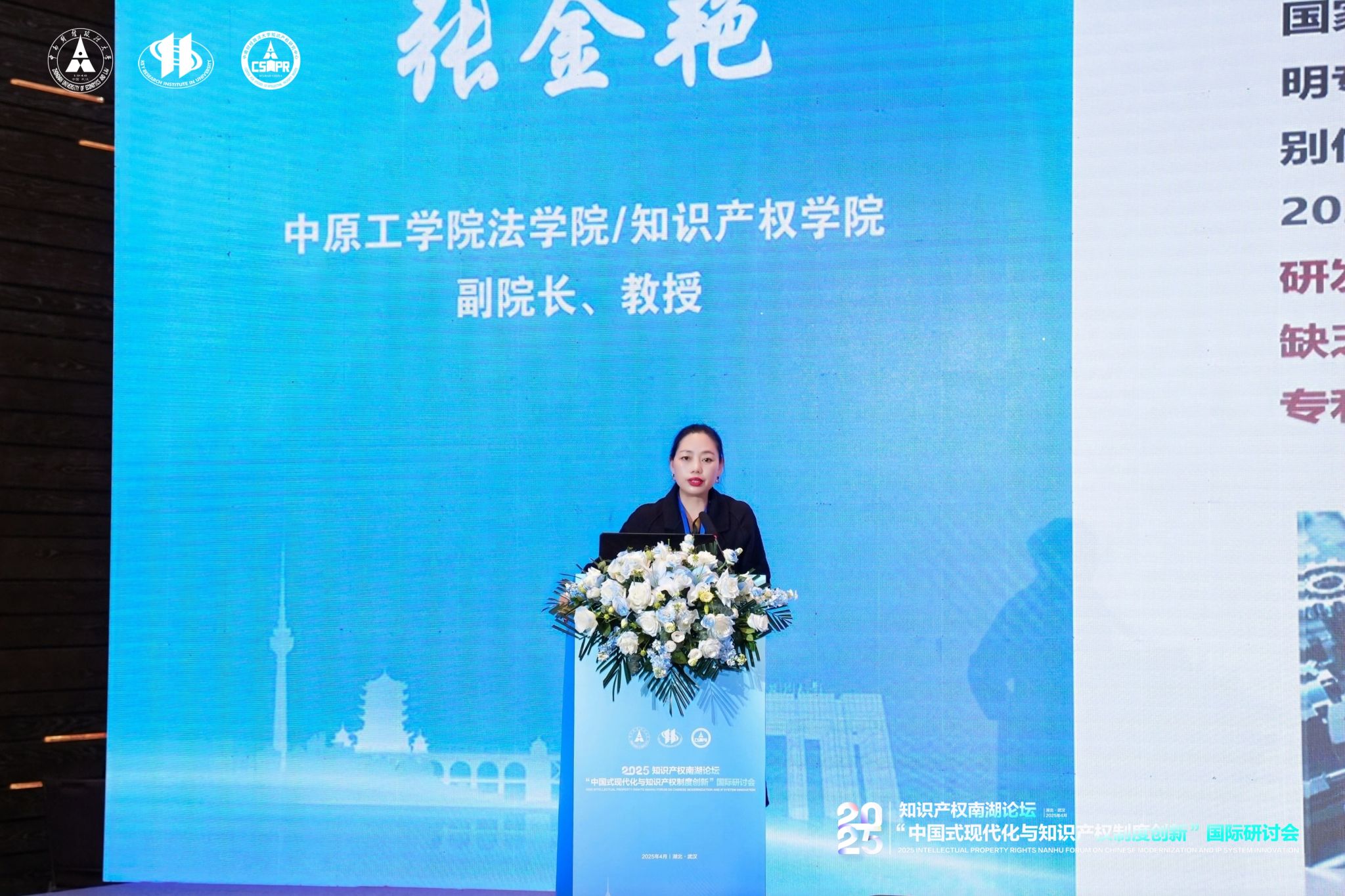 此外,副院长张金艳教授在分会场二“专利保护与知识产权强国建设”以“新质生产力发展下企业专利与标准的协同转化研究”为题进行发言。