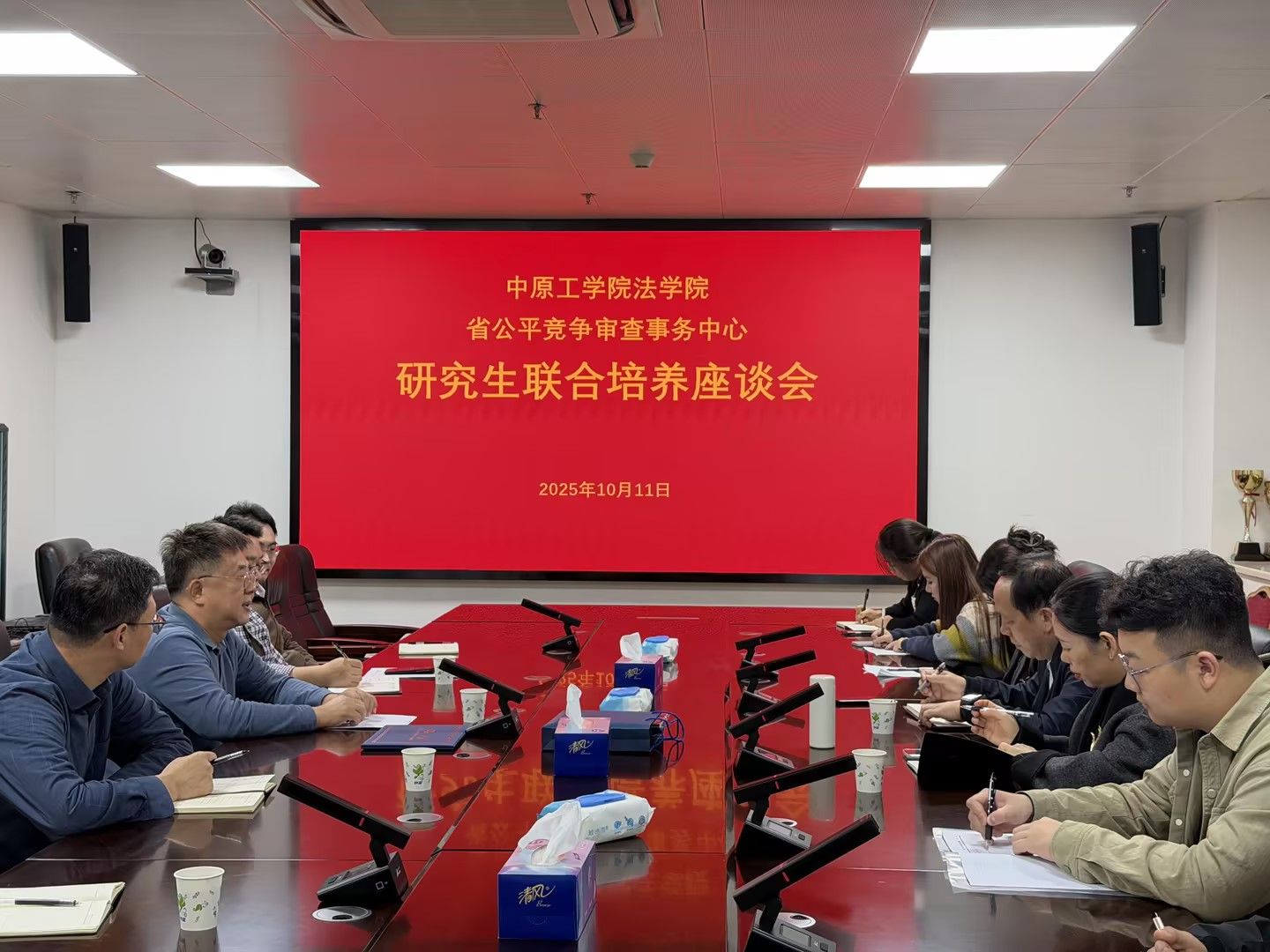 10月11日,我院院长王肃教授、副院长张金艳教授一行赴我院研究生教育创新培养基地——河南省公平竞争审查事务中心调研交流,2025级全体知识产权硕士与部分法律硕士参与本次研究生联合培养座谈会。