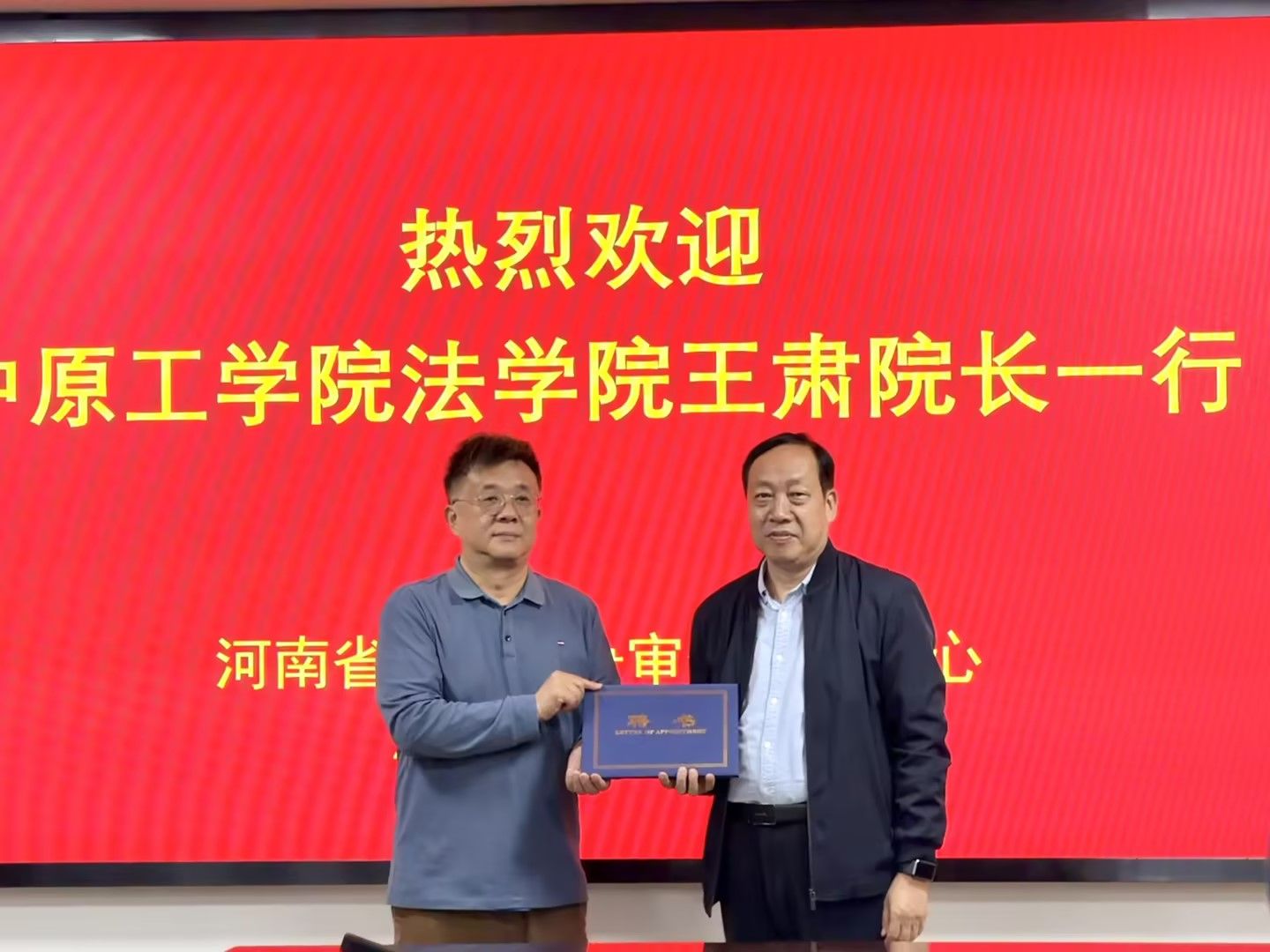 院长王肃教授为中心刘卫东主任颁发了校外导师聘书。其在交流中表示,河南省公平竞争审查事务中心是理论联系实际的优质平台,此次带领研究生同学前来,是学院深化教学改革、强化实践育人环节的重要举措之一。他鼓励同学们在今后的学习中,要更加关注政策动态和实务发展,努力成为既懂理论又熟悉实务的复合型人才,希望同学们能够珍惜此次学习机会,将课堂所学理论与实地所见实践紧密结合,不断拓宽学术视野,提升解决实际问题的能力,为未来投身于知识产权与公平竞争事业打下坚实基础。
