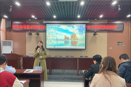 为了帮助学生树立正确的就业观、择业观,促进学生高质量充分就业,更好地服务学生职业探索,11月21日下午,我院在3号组团楼A607举办了郑州市域高校毕业生就业指导暨求职技能大赛2023年院级选拔赛。本次大赛以“破‘简’而出  勇往‘职’前 ”为主题,邀请了我校就业创业指导教授岳瑞凤、我院副院长付琛瑜和各专业系主任担任评委,100多名学生参加了此次活动。院级选拔赛由我院党委副书记陈义珊主持。