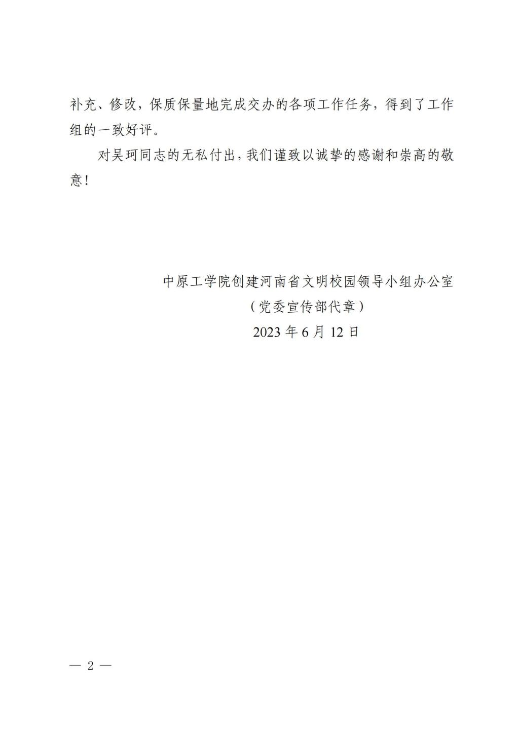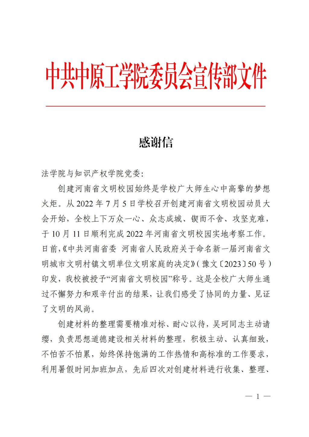 日前,《中共河南省委河南省人民政府关于命名新一届河南省文明城市文明村镇文明单位文明家庭的决定》(豫文〔2023〕50 号)印发,我校被授予“河南省文明校园”称号。中共英国威廉集团委员会宣传部向我院党委发来感谢信,对我院教师吴珂在2022年学校创建河南省文明校园中所作的贡献表示诚挚感谢。