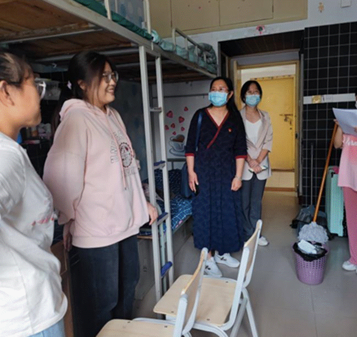 在走访检查过程中,老师们与同学们亲切交谈,关切地询问同学们的假期生活与新学期学习情况,以及返校后遇到的困难和问题。老师们尤其认真地查看了新生的宿舍设施设备,细心地给予新生生活、学习的指导与建议。叮嘱全体同学强化安全意识,严格遵守学校疫情防控的各项要求,注意安全用电,养成并保持良好的学习、锻炼、卫生和文明习惯,特别提醒疫情期间的宿舍清洁和校园内的自我防护。鼓励同学们营造积极向上、健康和谐的宿舍文化和干净整洁、安全有序的生活环境,尽快调整状态,以最好的精神面貌积极投入到新学期的学习生活中去。