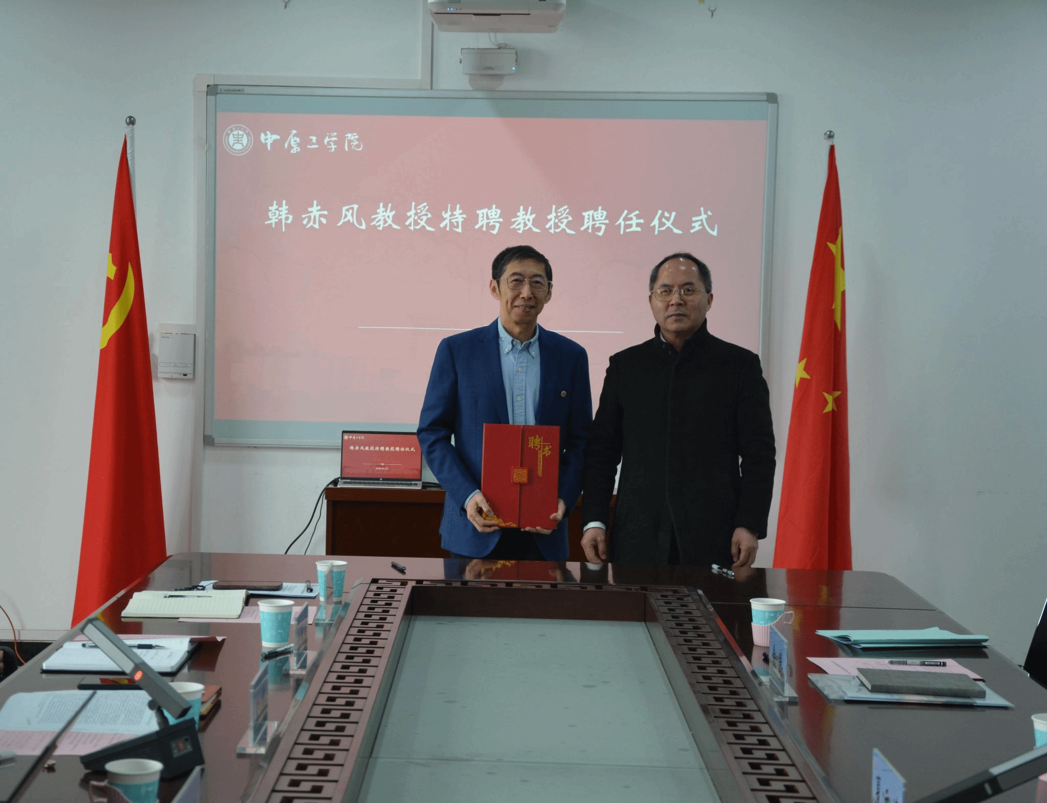 聘任仪式上,夏元清为韩赤风佩戴校徽,与韩赤风签订工作协议并为韩赤风颁发聘书。